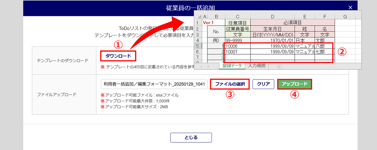 [ダウンロード](①)をクリックし、テンプレートをダウンロード、テンプレートを入力(②)後、上書き保存します。