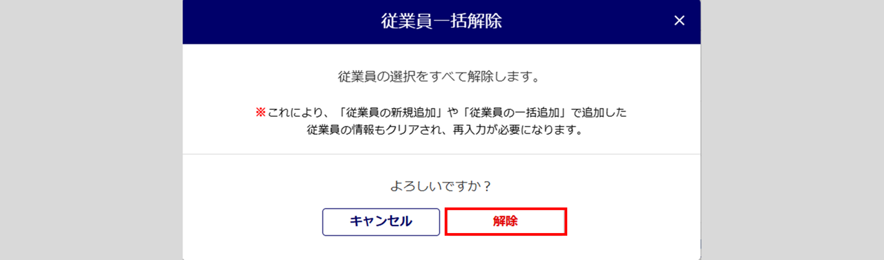 「従業員一括解除」画面の内容を確認し、問題なければ[解除]をクリックします。