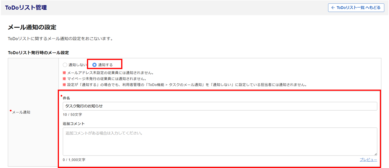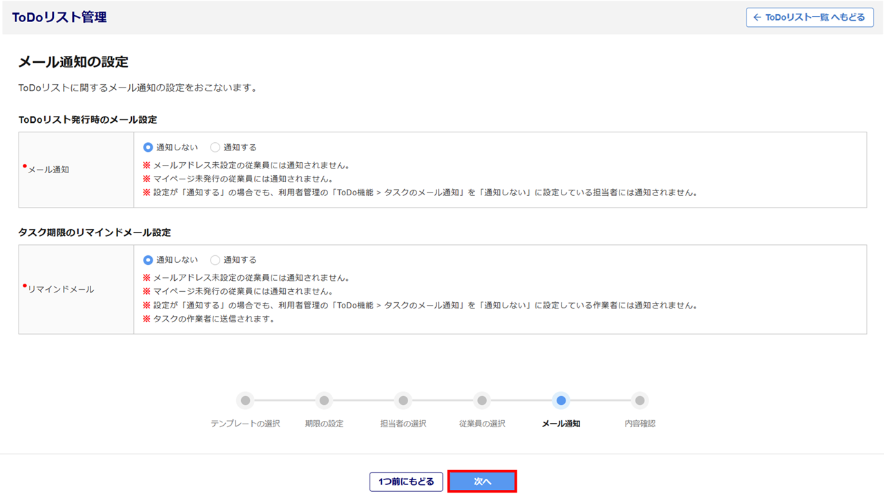 ToDoリスト発行時に従業員、担当に設定した利用者にメールを通知する場合は、「通知する」を選択します。