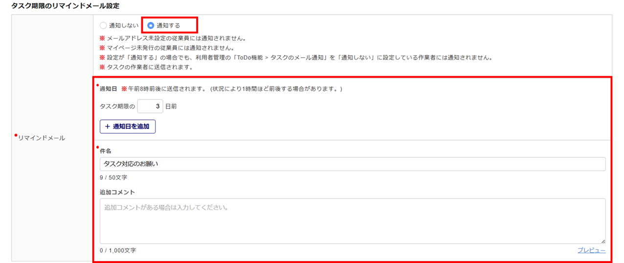 タスク期限のリマインドメール設定