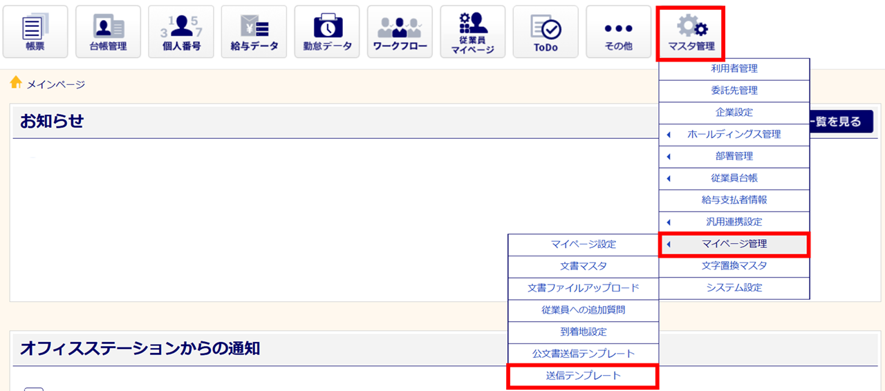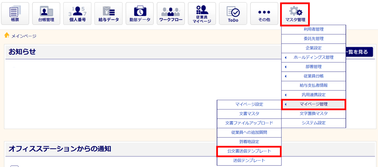 [マスタ管理]>[マイページ管理]>[公文書送信テンプレート]をクリックします。