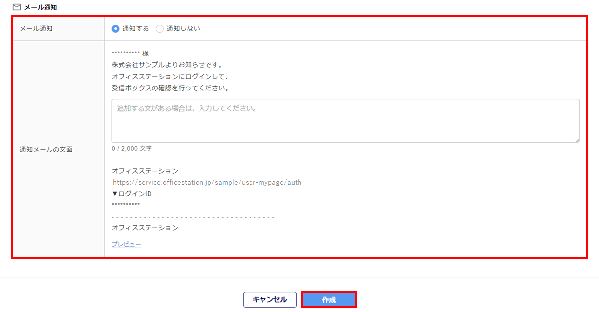 ファイル/メッセージ送信時に従業員へメールにて通知する場合、「メール通知」に「通知する」を選択します。