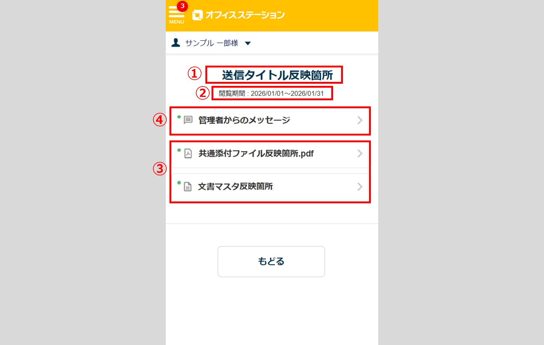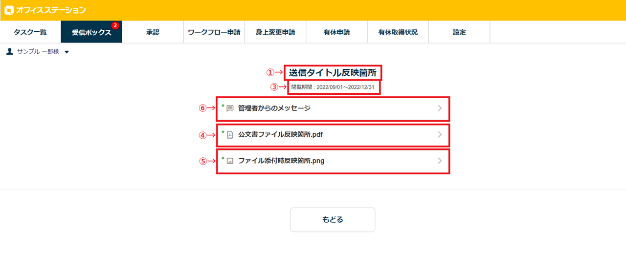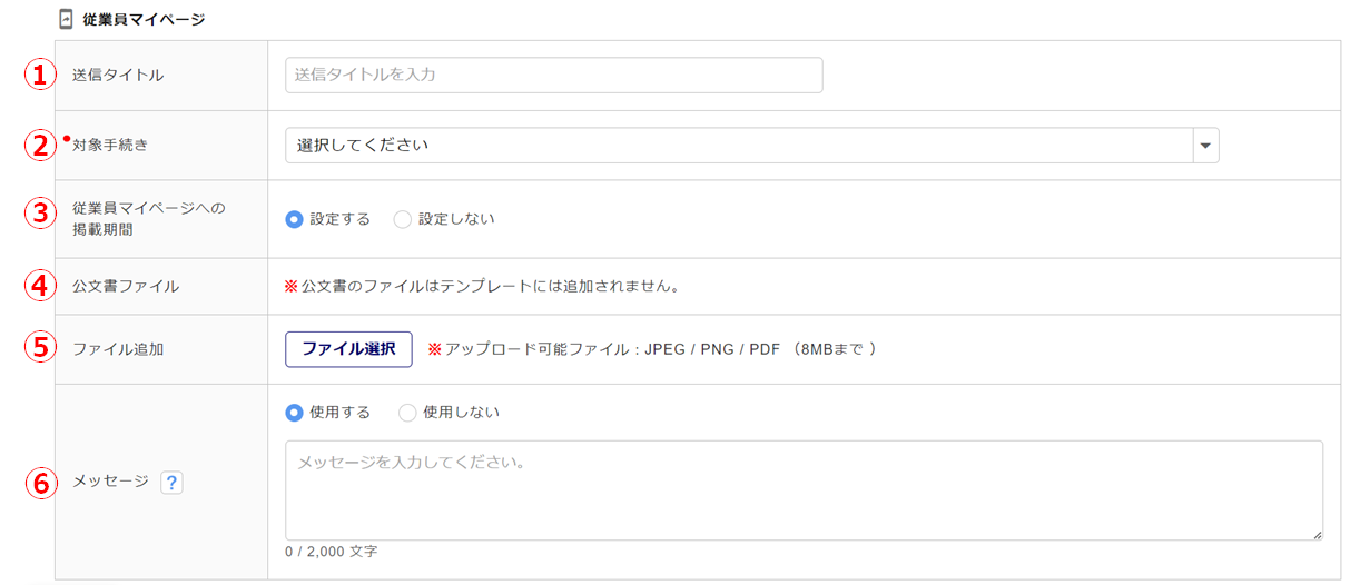 | ① | 送信タイトル | 従業員マイページに表示する、タイトルを入力します。 |