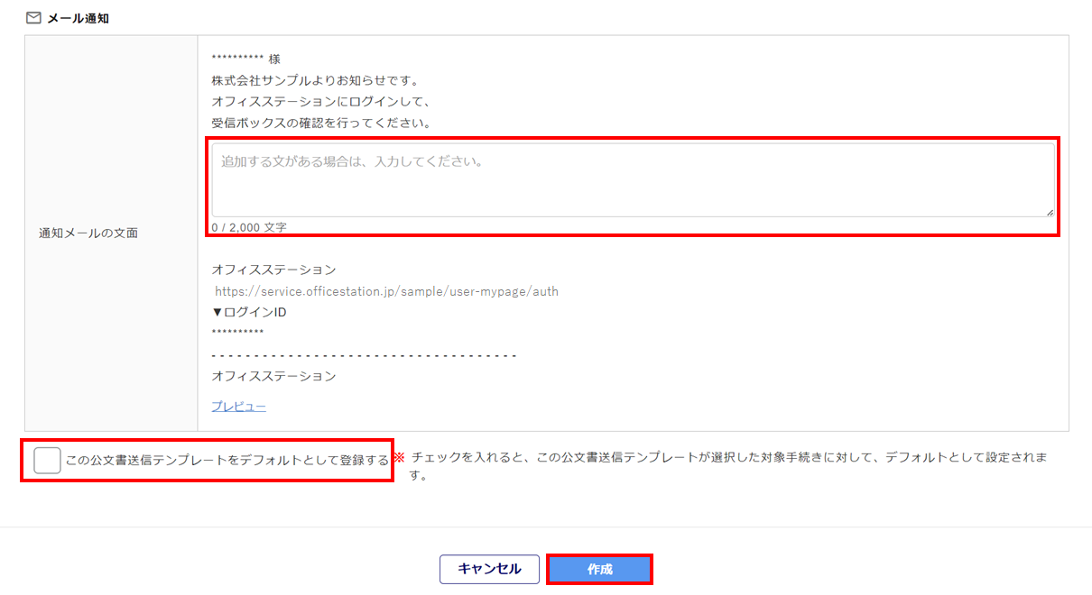 ※「共通用」を選択時は、「この公文書送信テンプレートをデフォルトとして登録する」は表示されません。