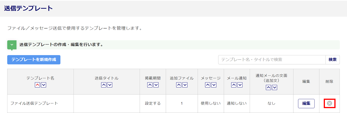 ※削除すると、テンプレート作成時にアップロードしたファイルも削除されますので、ご了承ください。
