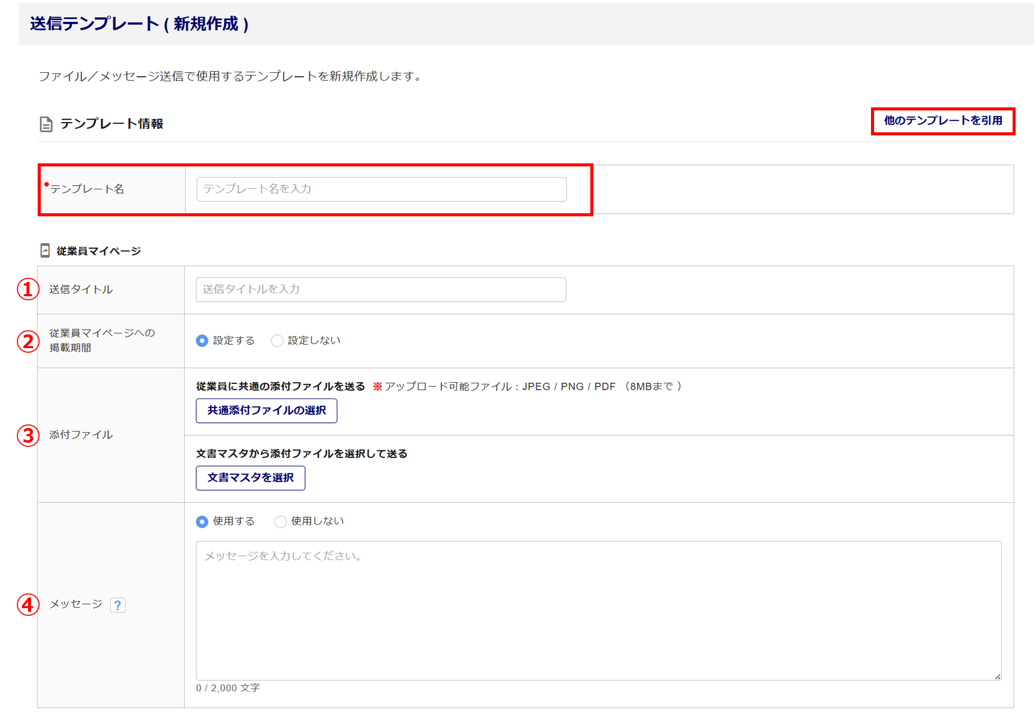 | ④ | 公文書ファイル | テンプレート作成時には設定や、入力の必要はありません。公文書を従業員マイページへ公開時に、ファイルを指定します。 |