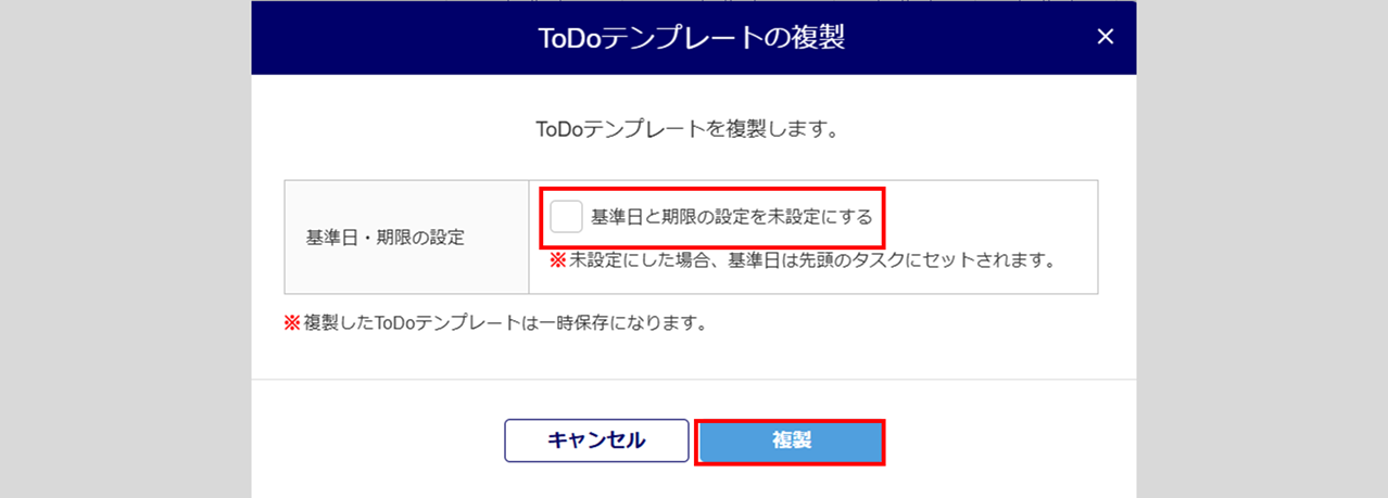 基準日と期限の設定を未設定にする場合、「基準日と期限の設定を未設定にする」にチェックし、[複製]をクリックします。