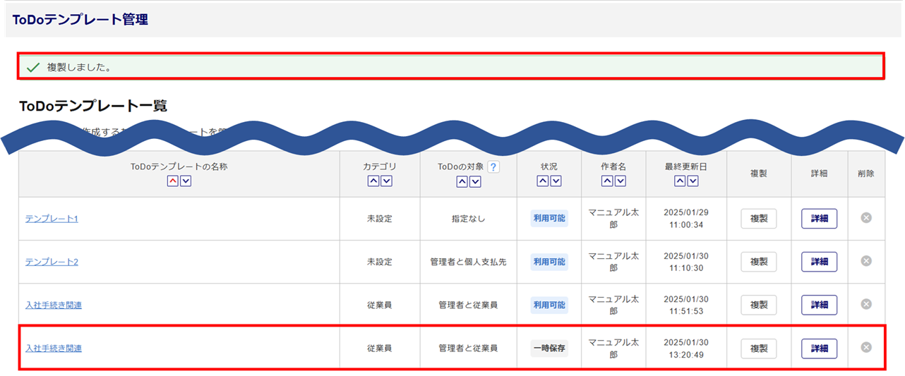※複製した場合、「状況」は「一時保存」となります。