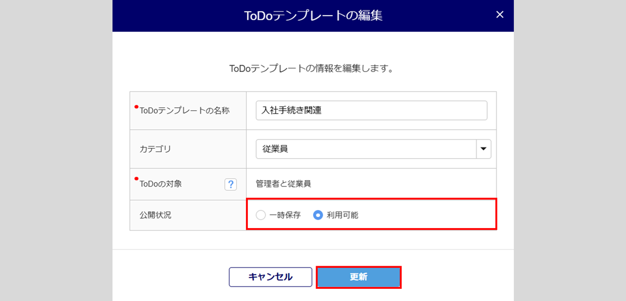 「公開状況」に「利用可能」を選択し、[更新]をクリックします。