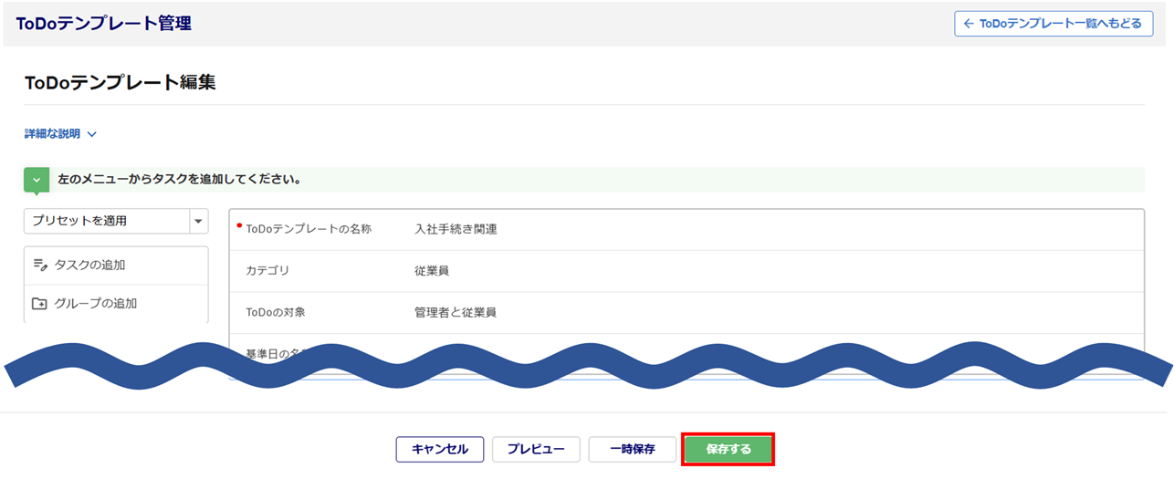 「一時保存」のテンプレートは、ToDoリスト発行することができません