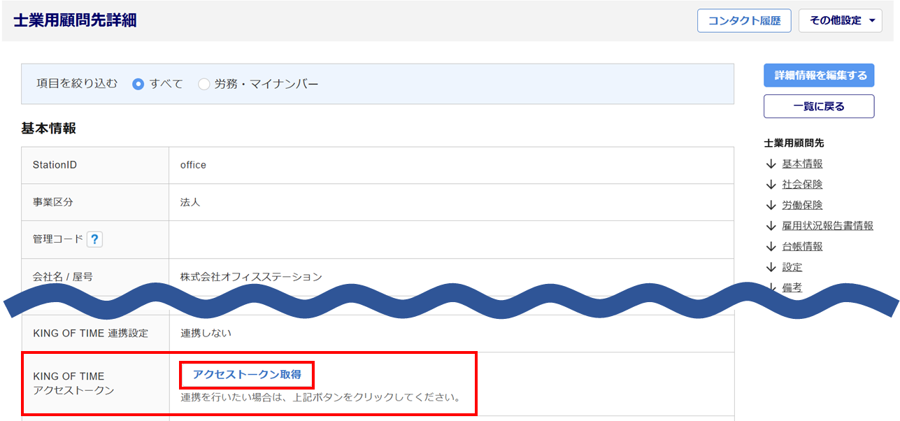 「士業用顧問先詳細」画面にて、「KING OF TIME アクセストークン」欄の[アクセストークン取得]をクリックします。
