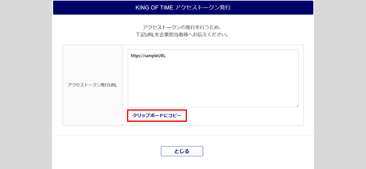 [クリップボードにコピー]をクリックし、「アクセストークン発行URL」を顧問先企業の担当者へお伝えください。