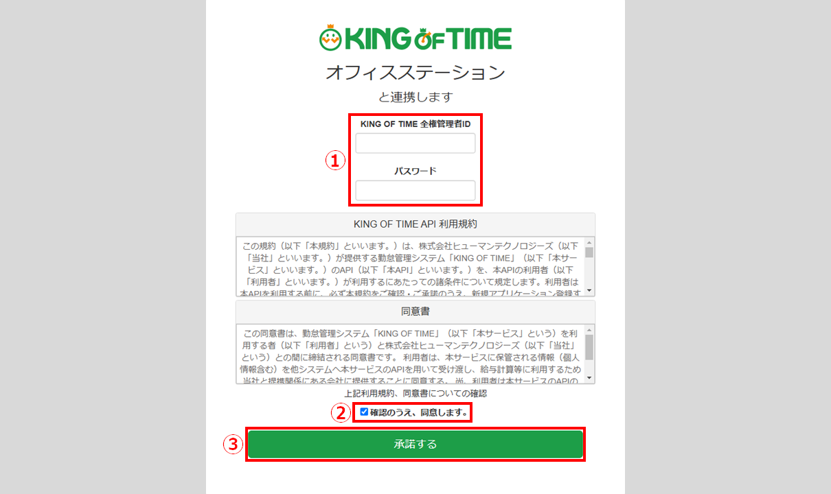 顧問先企業の担当者にて、「KING OF TIME 全権管理者ID」「パスワード」(①)を入力、「確認のうえ、同意します。」(②)にチェック、[承諾する](③)をクリックいただきます。