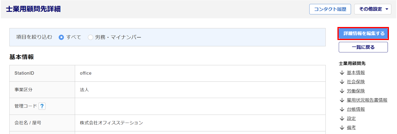 顧問先企業の担当者での操作が完了後、「士業用顧問先詳細」画面右側にある[詳細情報を編集する]をクリックします。