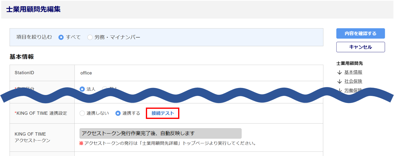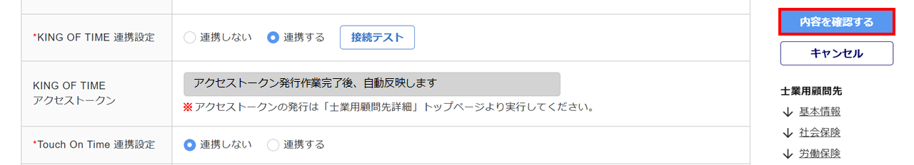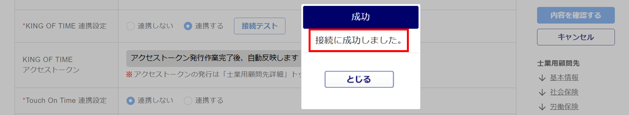 「KING OF TIME連携設定」欄の[接続テスト]をクリックし、接続に問題がないか確認します。