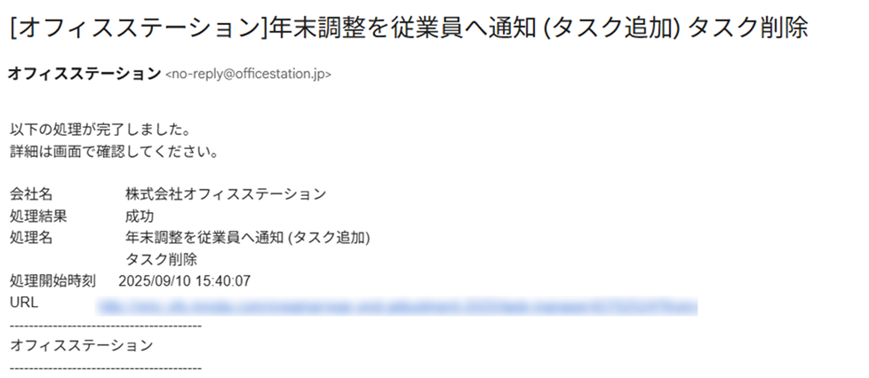 操作者のメールアドレスが登録されている場合は、年末調整のタスク削除完了時に登録メールアドレス宛に完了通知メールが送信されます。