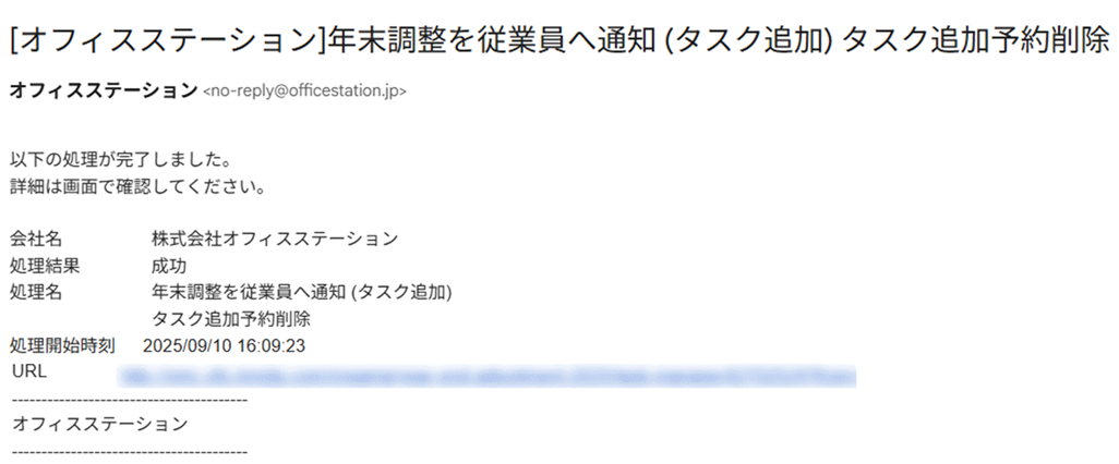 差出元のメールアドレスは「no-reply@officestation.jp」、メールの件名は「年末調整を従業員へ通知 (タスク追加) タスク追加予約削除」です。