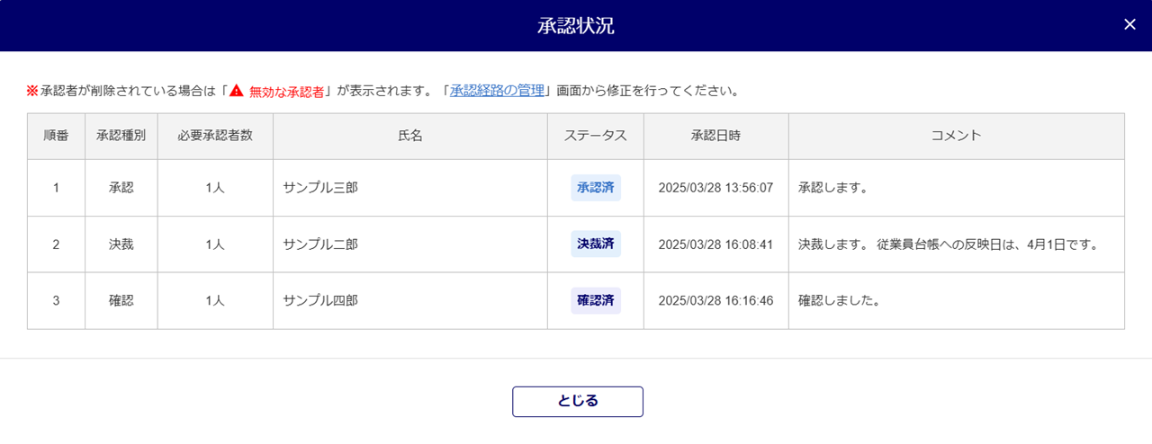 「現在の承認状況(担当者)」列の「完了」の青文字部分をクリックすると「承認状況」を確認できます。