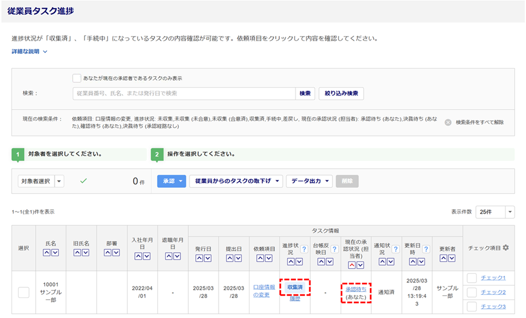 メインページ「未完了タスク一覧」内「口座情報の変更」の件数部分(ここでは[1件])をクリックすると、次の「従業員タスク進捗」画面で、「口座情報の変更」タスクを絞り込んだ状態で一覧に表示されます。