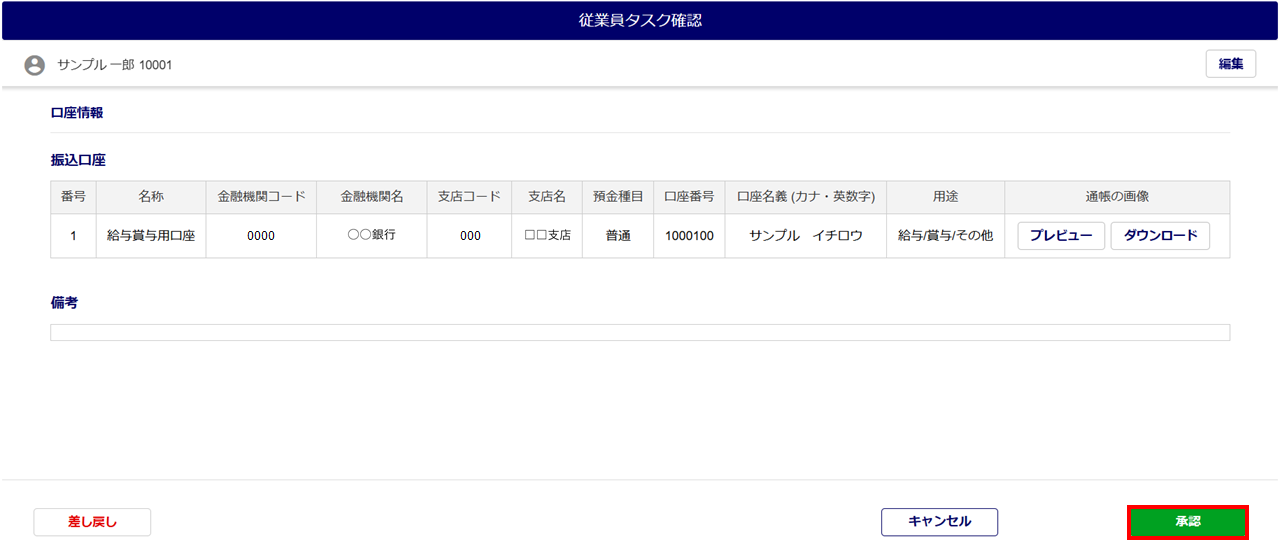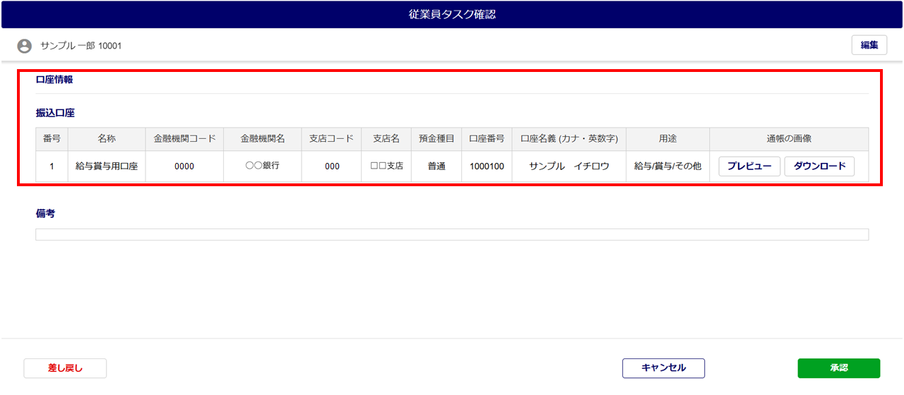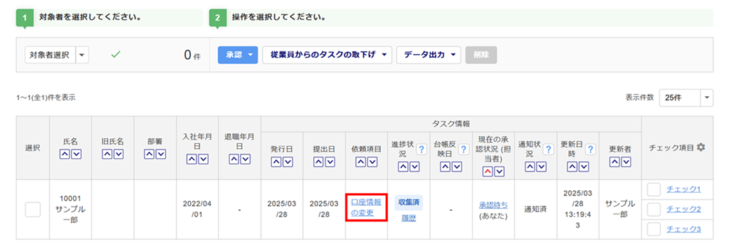 従業員から提出された口座情報の変更タスクを承認(決裁・確認)をおこなう方法について、ご説明します。