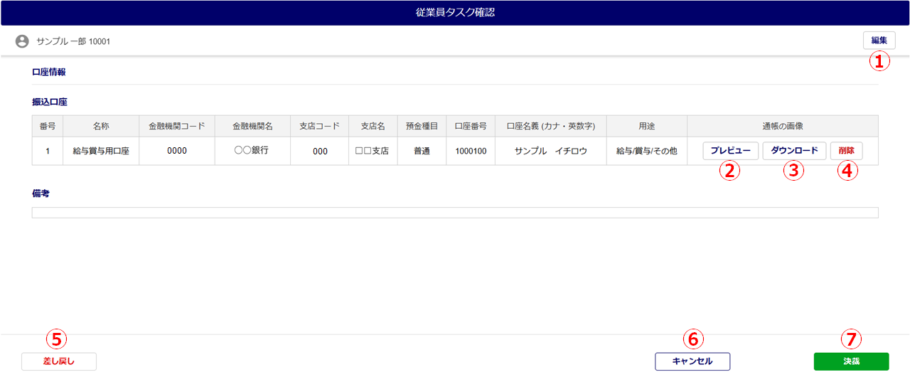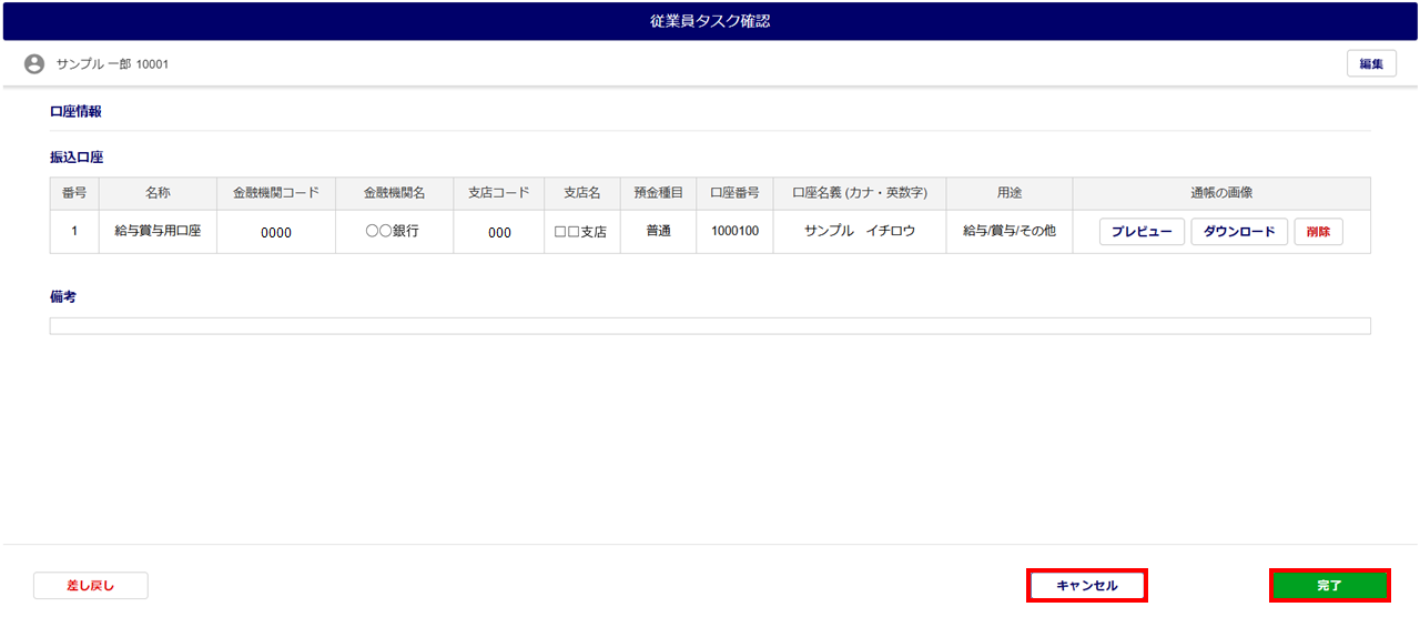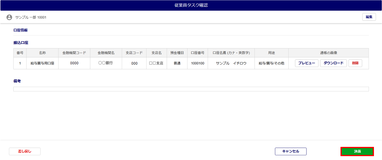 「決裁」をおこなうと、従業員台帳に口座情報の内容と通帳の画像が即時反映されます。 - 申請内容を従業員台帳に日付指定で反映する場合