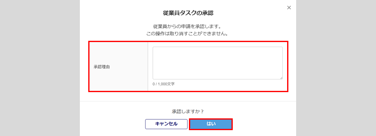 「承認理由」を入力し、[はい]をクリックします。「承認理由」の入力は任意です。