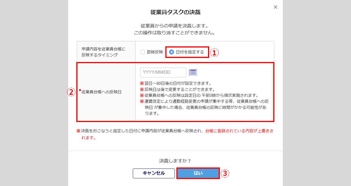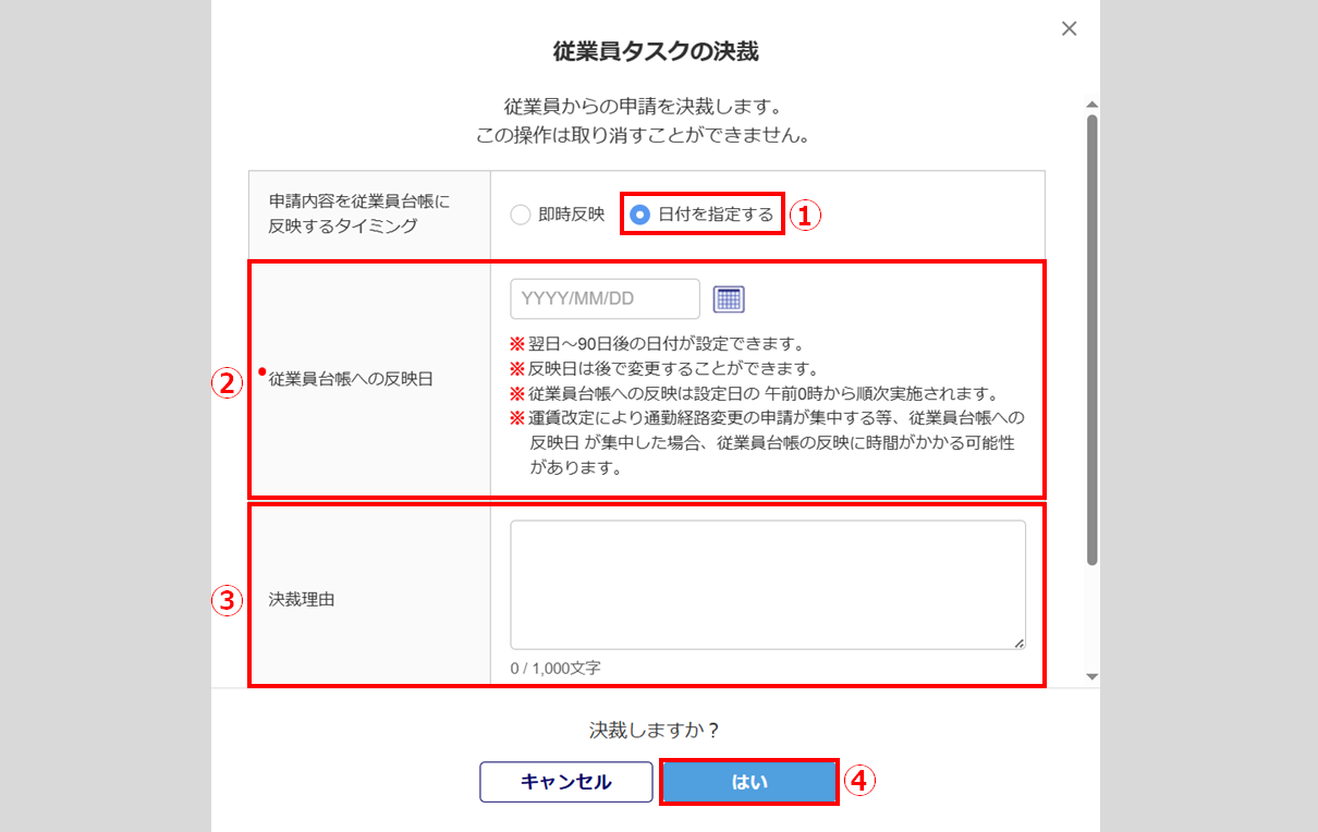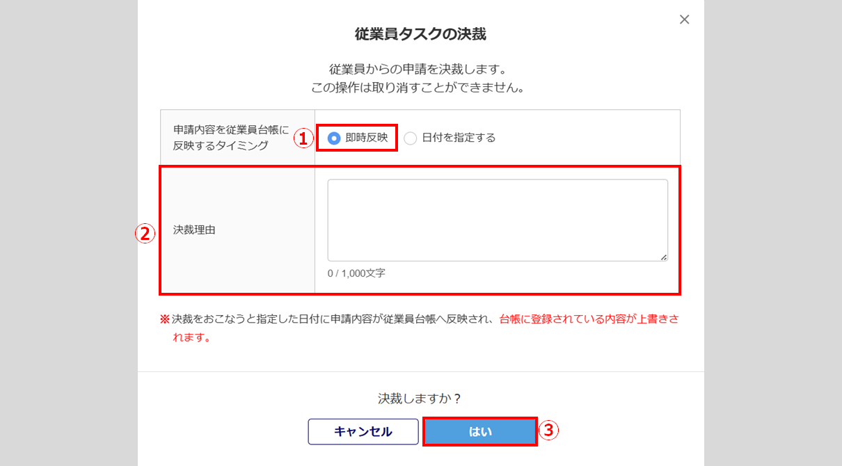 「申請内容を従業員台帳に反映するタイミング」に「即時反映」(①)を選択し、「決裁理由」(②)を入力、[はい](③)をクリックします。「決裁理由」の入力は任意です。
