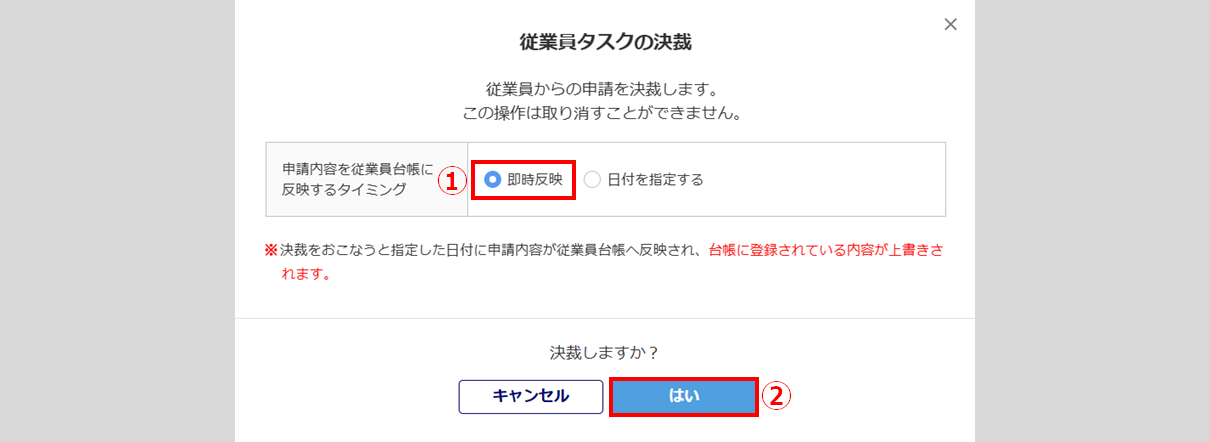 「申請内容を従業員台帳に反映するタイミング」に「即時反映」(①)を選択し、[はい](②)をクリックします。