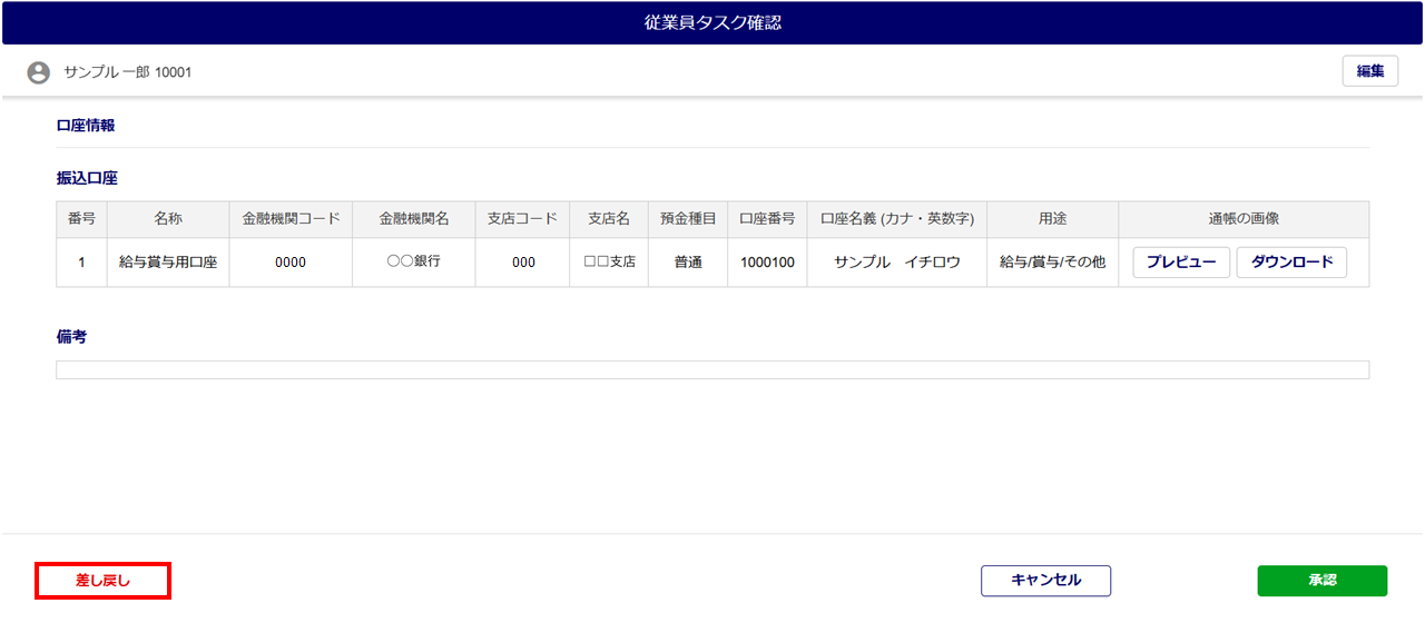 従業員から提出された内容に不備があり、従業員本人に情報の修正を依頼する場合は、差し戻しをおこないます。