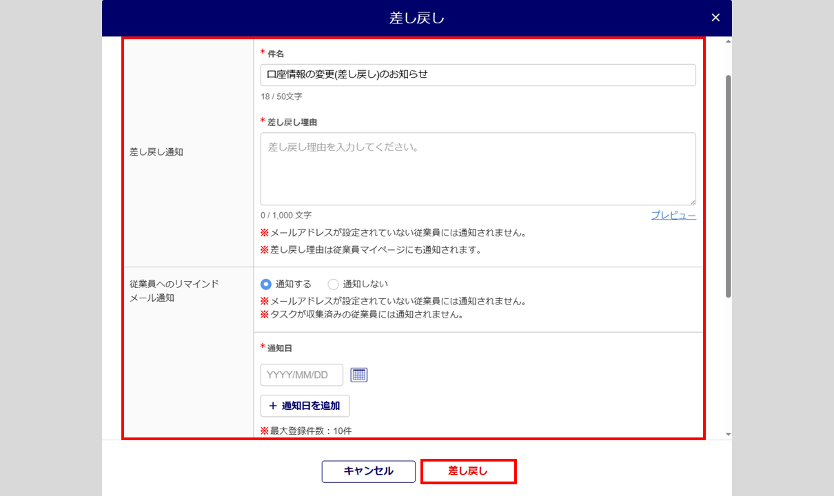 「差し戻し通知」「従業員へのリマインドメール通知」を設定し、[差し戻し]をクリックします。