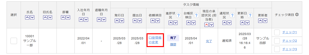 「依頼項目」列の [タスク名]をクリックすると、完了したタスクの内容を確認できます。