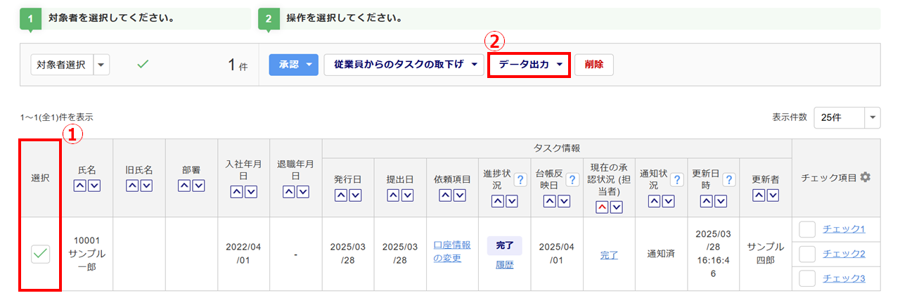 出力対象の「選択」列(①)にチェックし、[データ出力](②)をクリックします。