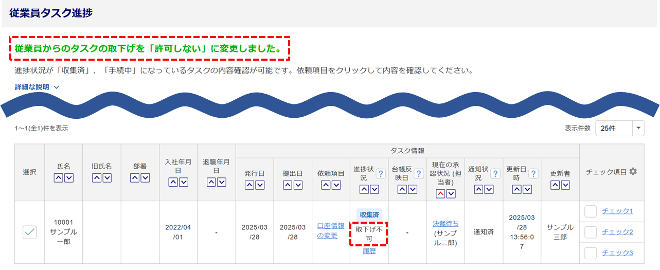 画面上部に「従業員からのタスクの取下げを「許可しない」に変更しました。」と表示され、「進捗状況」列に「取下げ不可」と表示されたら、タスク取下げの設定は完了です。