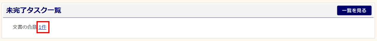 メインページ「未完了タスク一覧」内「文書の合意」の件数部分(ここでは[1件])をクリックすると、次の「従業員タスク進捗」画面で、「文書の合意」タスクを絞り込んだ状態で一覧に表示されます。