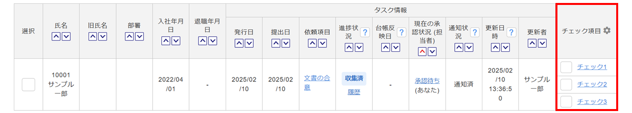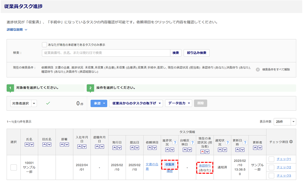 従業員からタスク提出済みの場合、「進捗状況」列に「収集済」と表示されます。