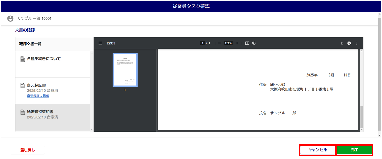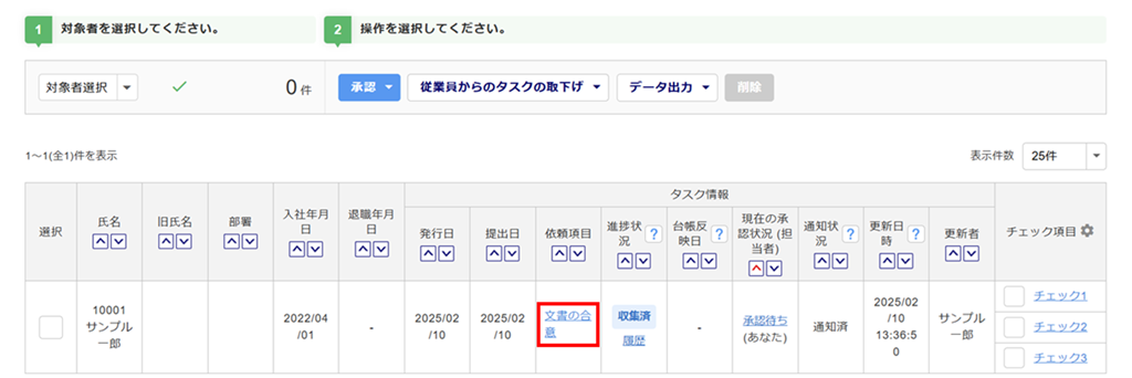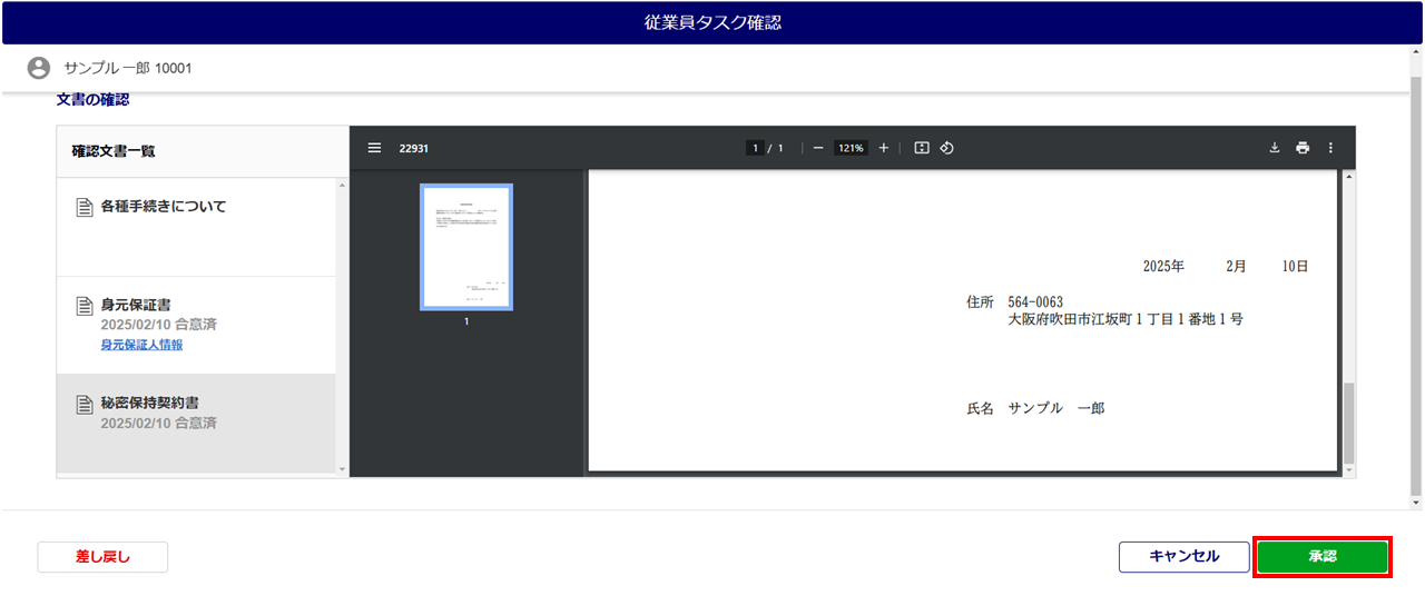 従業員から提出された文書の合意タスクの内容を確認します。