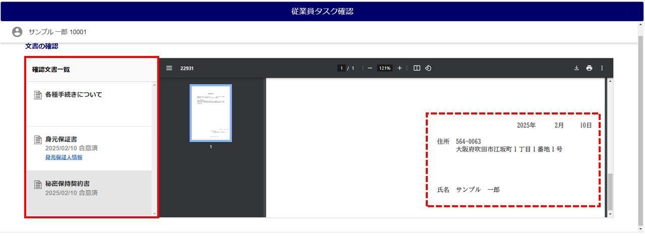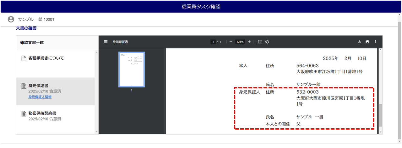 また、「確認文書一覧」内の[身元保証人情報]をクリックすると、身元保証人の情報を確認できます。