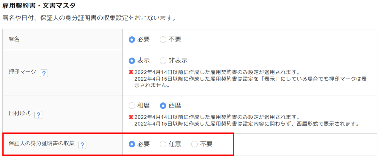 ※「身元保証人の身分証明書」は、[マスタ管理]>[マイページ管理]>[マイページ設定]の「雇用