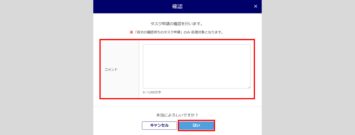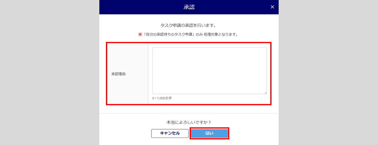 「承認理由」を入力し、[はい]をクリックします。「承認理由」の入力は任意です。