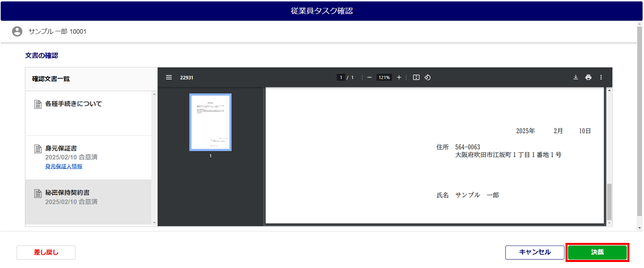 ・「決裁」をおこなうと、従業員台帳に合意文書が反映されます。