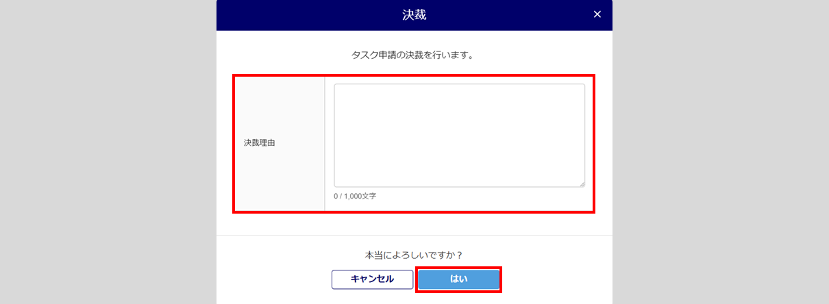 「決裁理由」を入力し、[はい]をクリックします。「決裁理由」の入力は任意です。