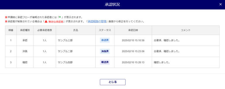 「現在の承認状況(担当者)」列の「承認待ち」「決裁待ち」「確認待ち」「完了」の青文字部分をクリックすると「承認状況」を確認できます。