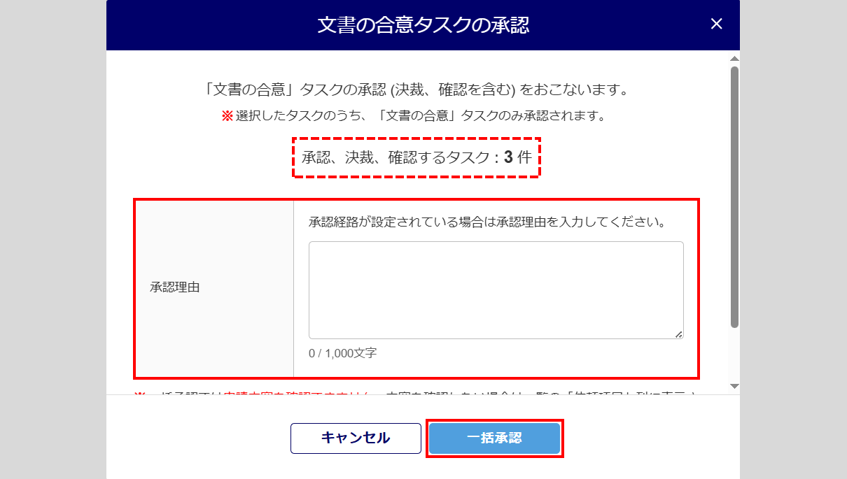 「承認理由」を入力し、[一括承認]をクリックします。