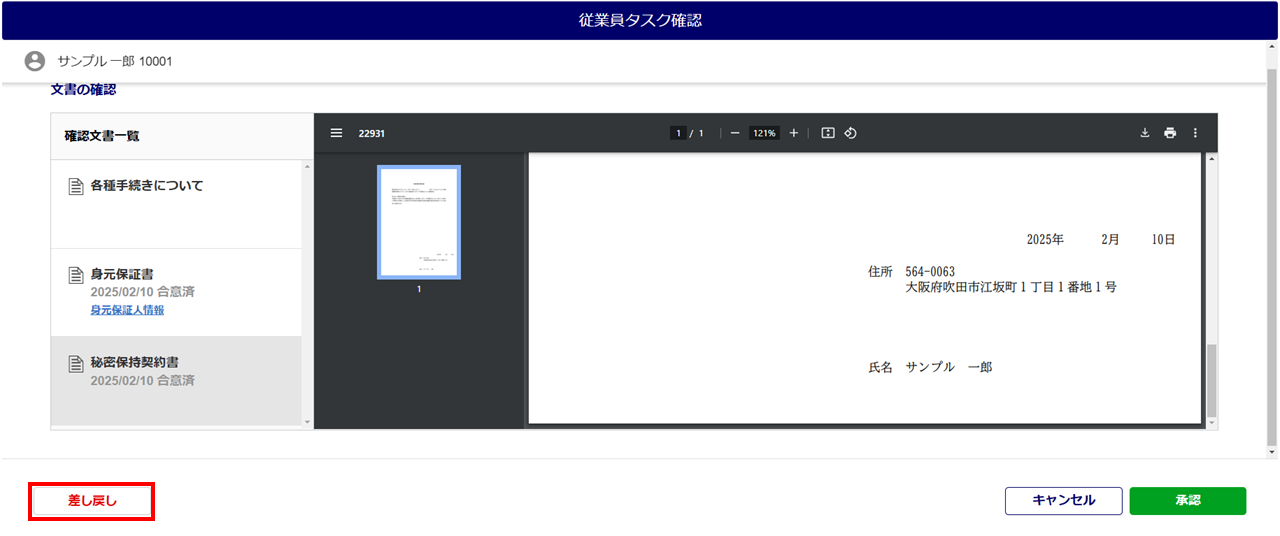 文書の中に身元保証人の合意がいる文書が含まれている場合のみ、従業員へ差し戻しできます。