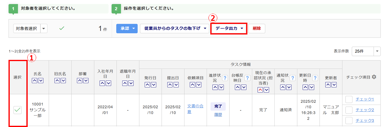 出力対象の「選択」列()にチェックし、[データ出力]()をクリックします。