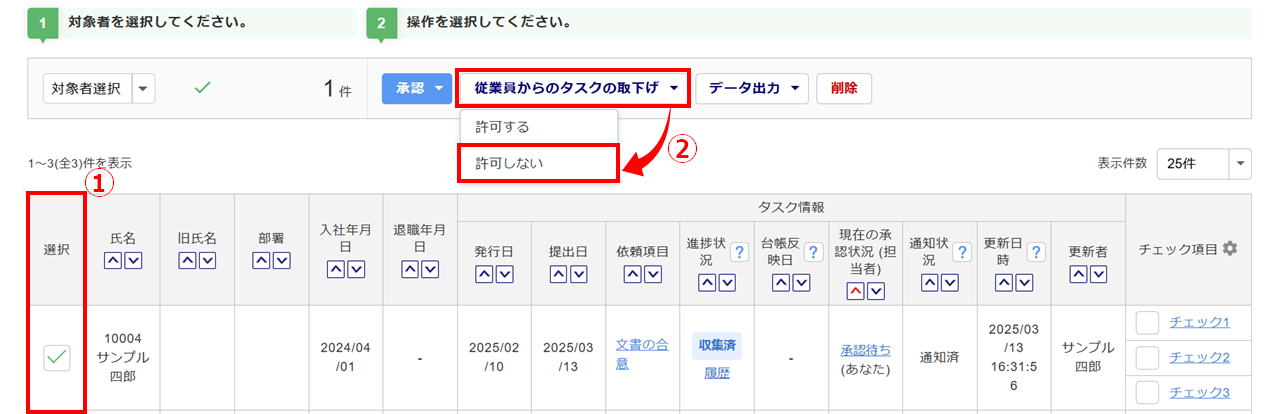 取下げを不可にする従業員の「選択」列()にチェックし、[従業員からのタスクの取下げ]>[許可しない]()をクリックします。