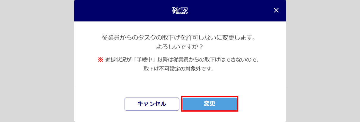 画面上部に「従業員からのタスクの取下げを「許可しない」に変更しました。」と表示され、「進捗状況」列に「取下げ不可」と表示されたら、タスク取下げの設定は完了です。