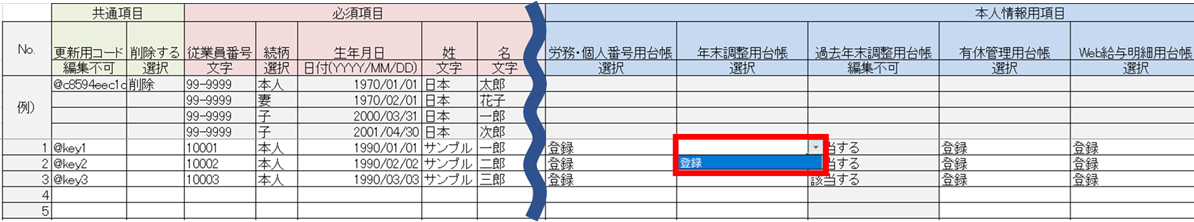 ※「過去年末調整用台帳」列は参照項目のため、変更できません。