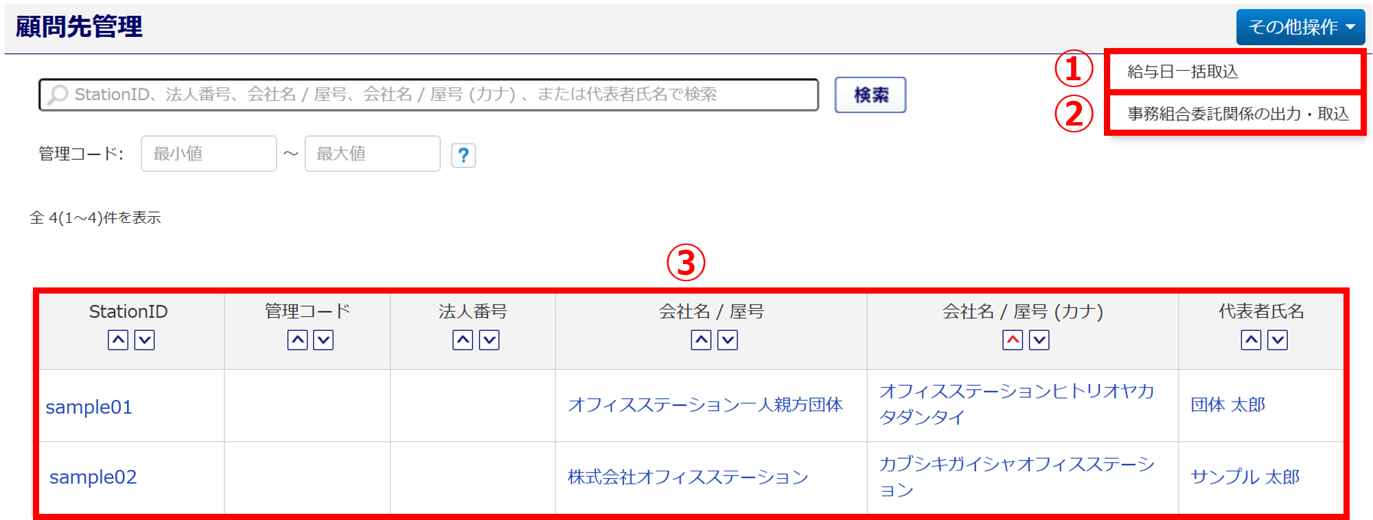事務組合機能の[マスタ管理]>[顧問先管理]の情報と、オフィスステーション本体の[マスタ管理]>[士業用顧問先管理]の情報は連動しています。