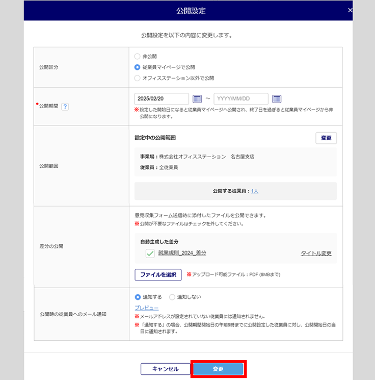 「公開期間」「公開範囲」「差分の公開」「公開時の従業員へのメール通知」が設定可能になります。